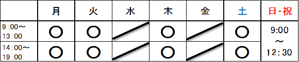 10:00~13:00 14:00~19:00 ※ 中休みの13:00~14:00は営業しておりません。 |